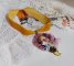 Un ensemble de fleurs accompagnent ce motif comme : clochettes, perles rondes nacrées, fleurs floquées velours, feuilles torsadées, étamines en fil de coton, nœud satin fait-main, rocailles japonaises et tchèques.