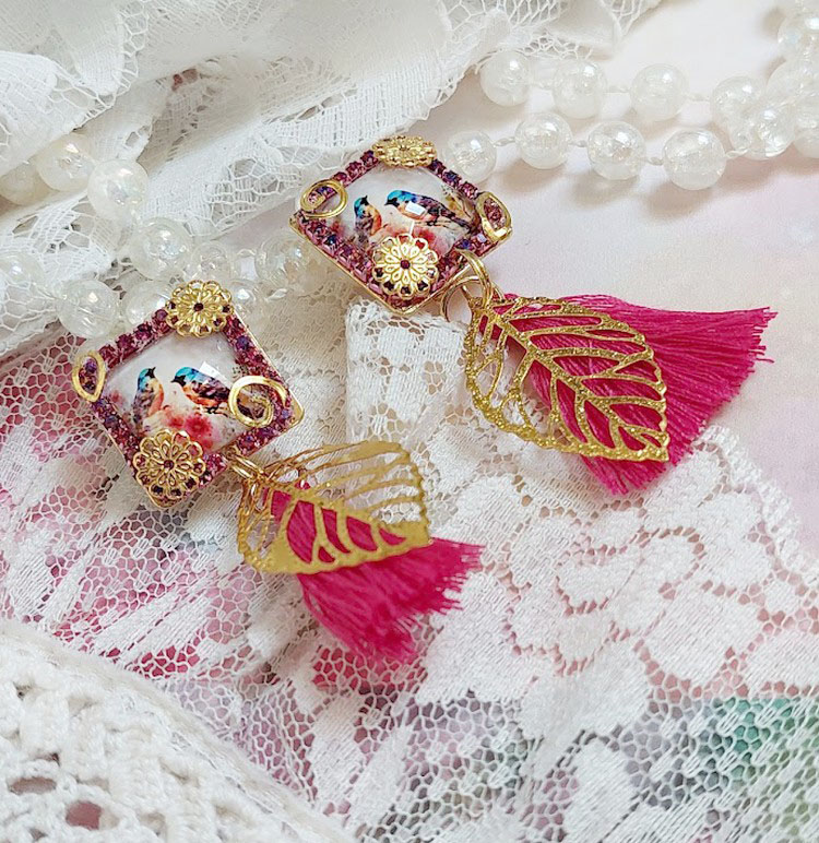 Ces boucles d’oreilles clips en laiton sont créées avec des cabochons carrés en verre représentant 2 oiseaux sur une fleur à laquelle s’ajoute des intercalaires en forme de fleur filigranée et breloques feuilles en laiton