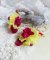 J’ai ajouté avec les mini-gouttes des perles Gold Filled 14 carats, fleurs synthétiques Rouges et toupies Light Topaz de qualité AB en Cristal Swarovski.
